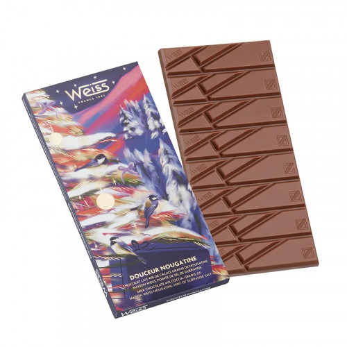 Un chocolat au lait 41% onctueux qui se marie parfaitement à la texture croquante de la nougatine ! Une expérience généreuse qui offre un sublime contraste en bouche.